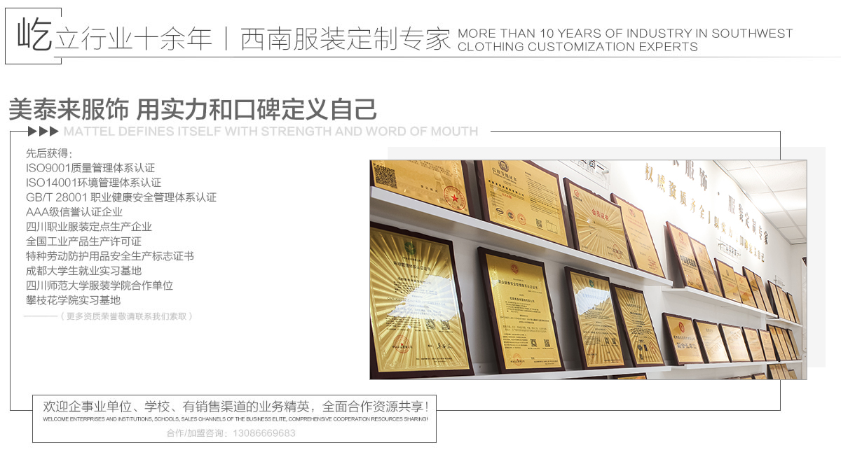 美泰来坚持以品牌经营为核心发展战略,在10余年的发展中,注重产学研结合,成为四川师范大学服装学院合作单位,攀枝花艺术学院校外实习基地,成都大学生就业实习基地,AAA级企业信用企业,四川职业服装定点生产企业,四川省知名品牌,四川质量诚信达标示范单位等,上市公司希努尔男装四川地区团购营销服务中心,美泰来多年服装经营,已经成为集多项国家省市荣誉为一身的知名服装企业。